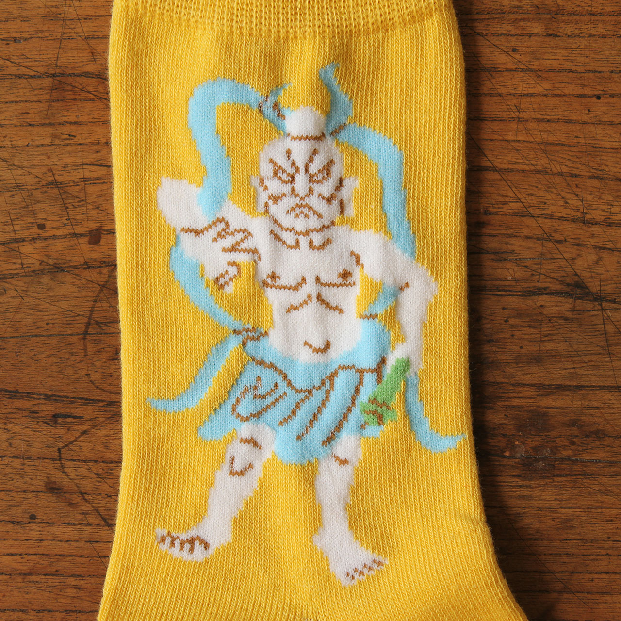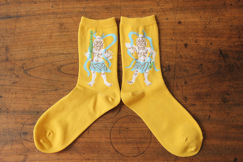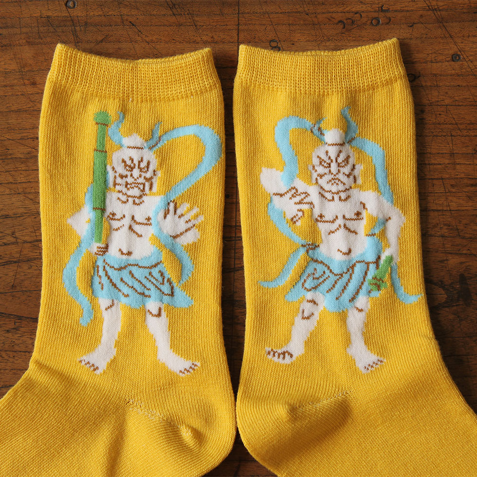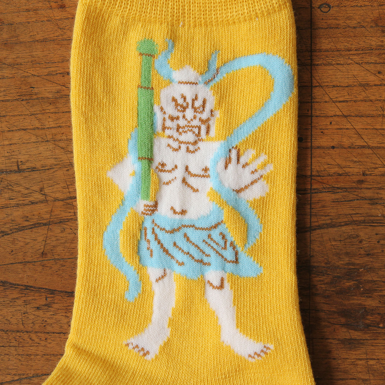 KONGO RIKISHI AUM SOCKS features two Nios: Agyo on the left and Ungyo on the right.Kongo Rikishi (Nio) are two protectors standing still today at the entrance of many Buddhist temples. As you can see from their muscular body and legs, they are known as deities of health and fortitude.