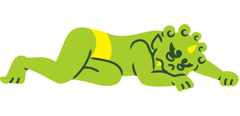 His fierce faced appearance is a little scary, so we designed a child-like rounded cute form.