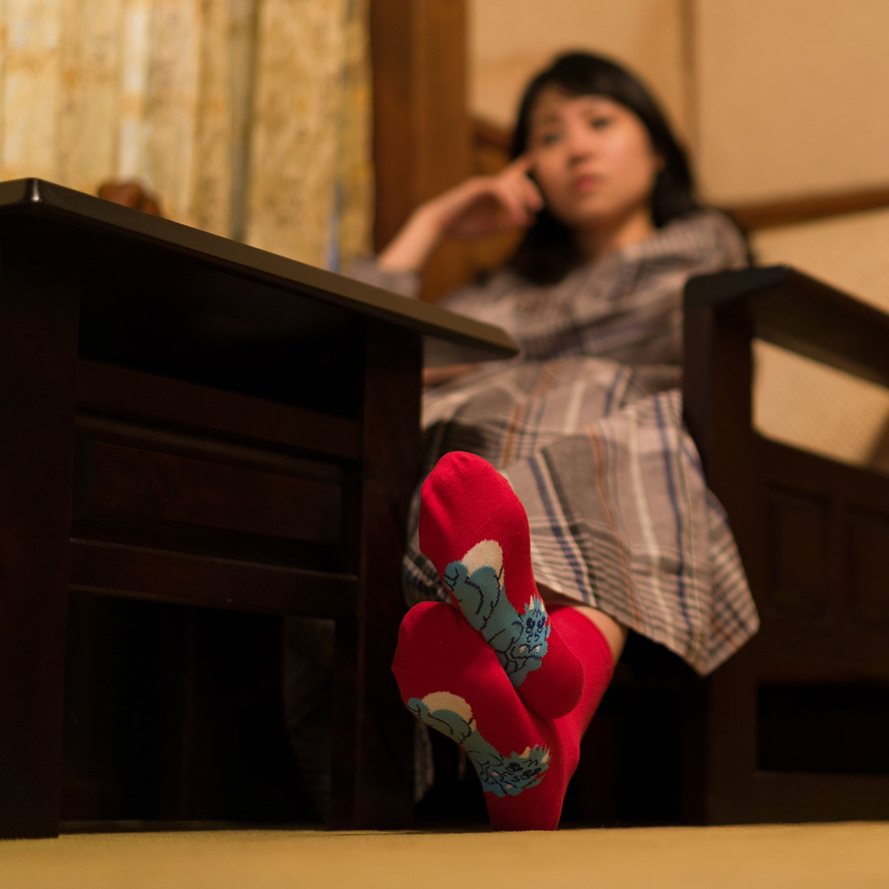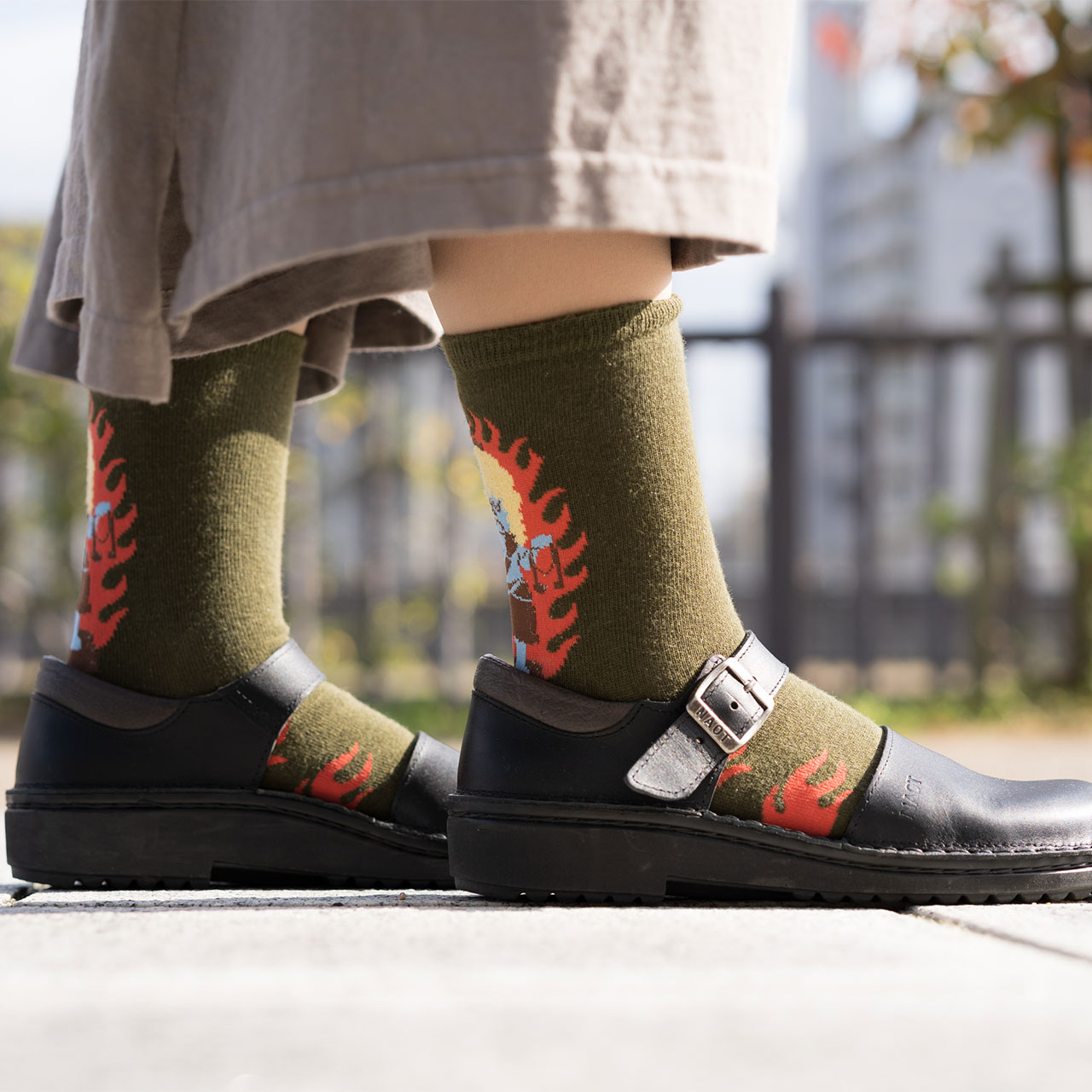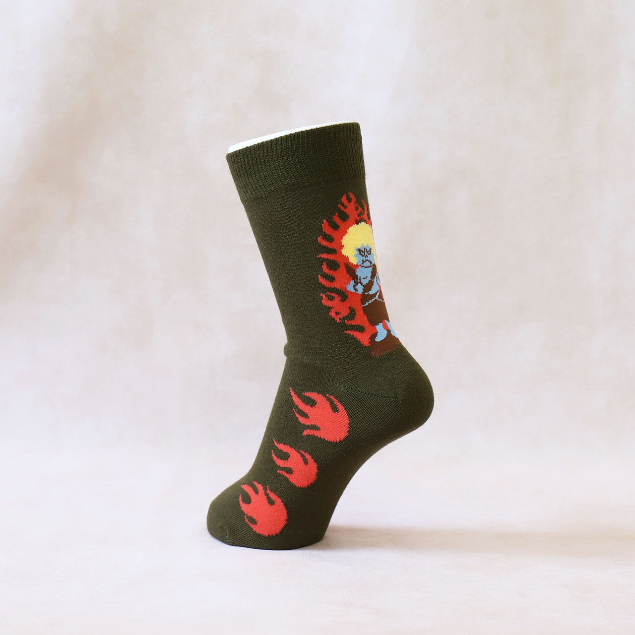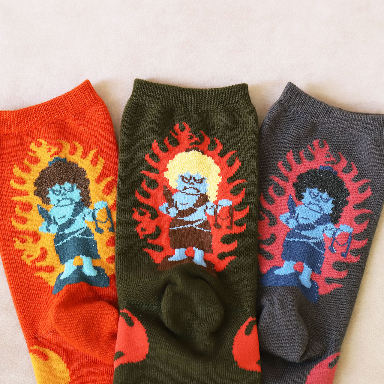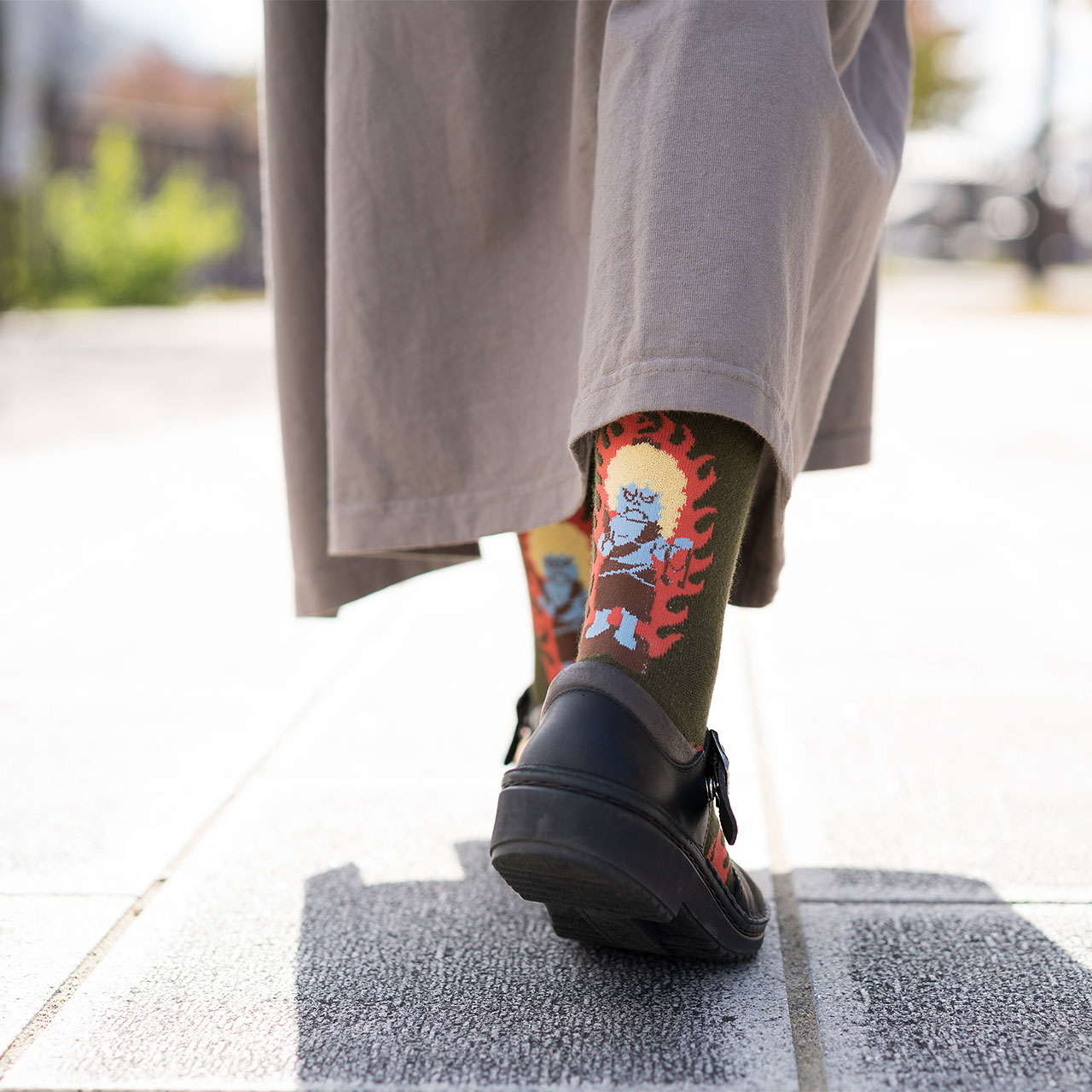 BUTSUSHITA OFUDO SOCKS feature Fudo Myo-o at the ankle and flames at rear.Fudo Myo-o is colloquially called “Ofudo-san” and is popular across a wide range of generations. Mashroba adopted this god so that our plucky fashionistas can feel his existence and support closely.